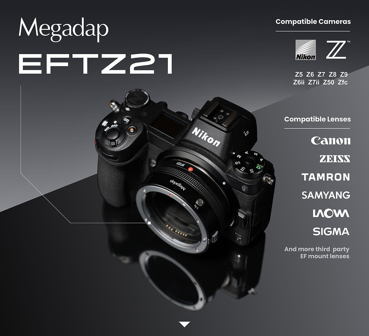 Megadap EFTZ21 là Bộ chuyển đổi sáng tạo cho phép các nhiếp ảnh gia sử dụng các ống kính Canon EF trên máy ảnh Nikon Z, bao gồm cả dòng full-frame và APS-C,. EFTZ21 mở ra hơn 150 tùy chọn ống kính EF mới cho người dùng Nikon Z và mang lại nhiều cơ hội sáng tạo mới.