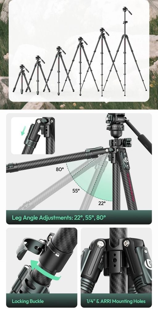Thiết kế chân máy làm từ sợi carbon với cột giữa hai phần để chụp ảnh trên cao góc thấp